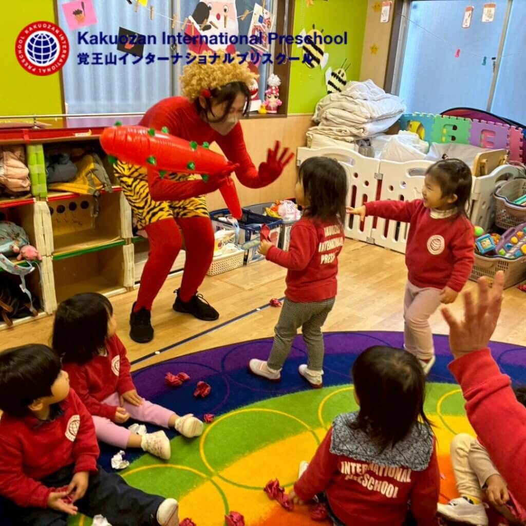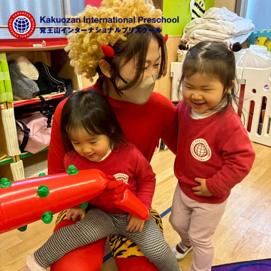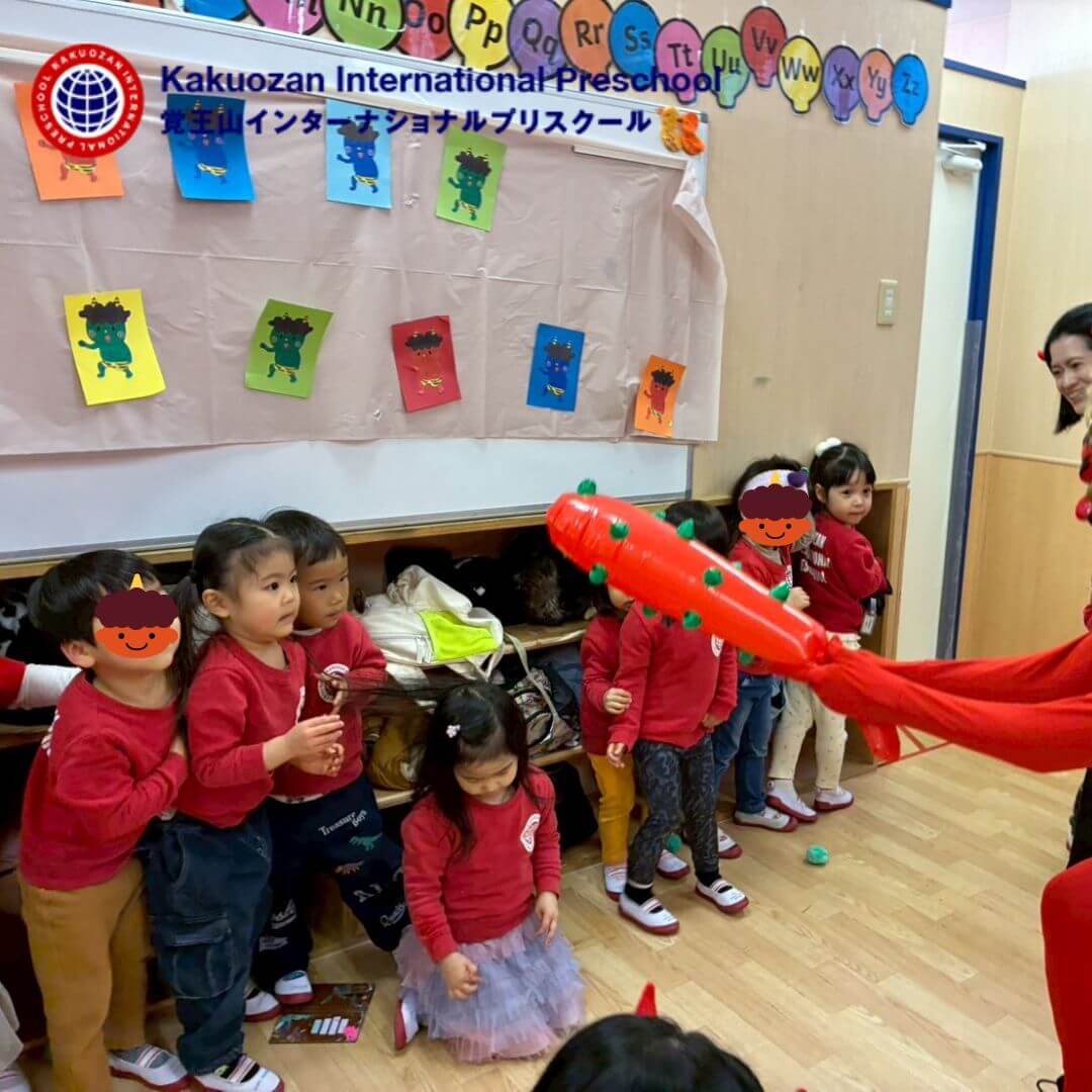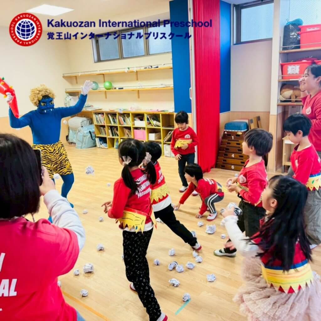 Through stories, songs, and hands-on activities, the children learned about Setsubun while practicing simple English phrases such as “Go away, ogre!” and “Welcome good luck!” To make the experience extra special, an ogre came to visit our school! The children bravely threw make-believe beans and shouted “Go away, ogre!” as they learned about this traditional Japanese event in a safe and playful way.