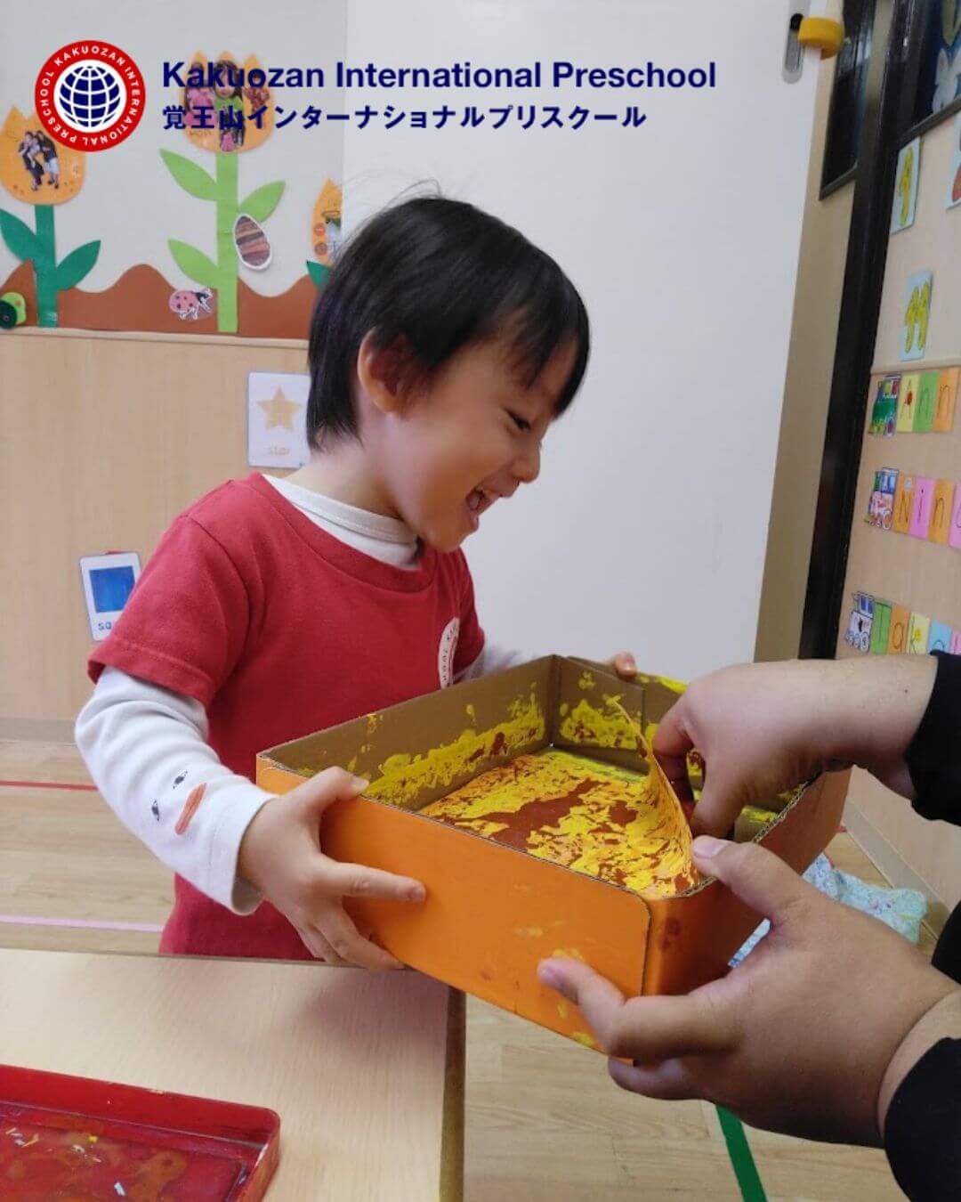 The Orange and Yellow Ducklings Class (2~3 years of age) have fun every day. They love doing interesting art projects like painting with balls to create patterns and lines. They also enjoy running and playing at Shiroyama Park with their friends. Everyday is full of laughter and learning. Great job Ducklings.