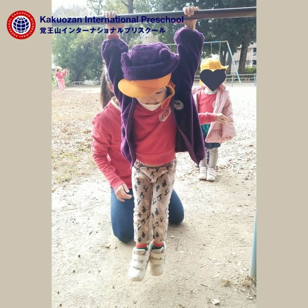覚王山インターナショナルプリスクールの年少Hummingbirdsクラスは鉄棒にぶら下がる練習を公園でしました。子供たちはどうやって長く鉄棒にぶら下がっていられるか、どうやったら地面に足がつかないようになるか、自分で考え楽しく練習していました。このぶら下がりは前回りをする第一段階のステップです。これから子ども達が前回りや、逆上がりができるようになっていくのが楽しみです。